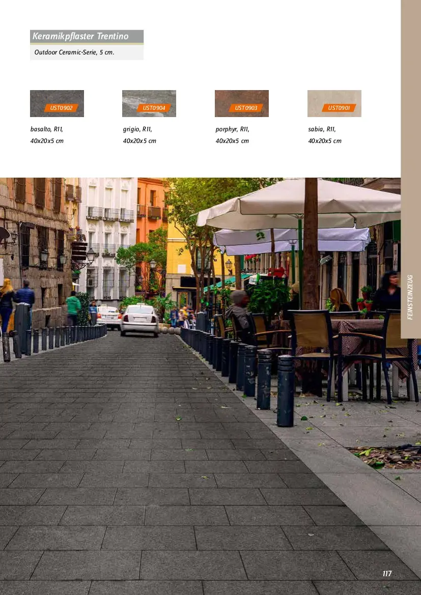 117  Keramikpflaster Trentino  Outdoor Ceramic-Serie, 5 cm.  basalto, R11,  40x20x5 cm  grigio, R11,  40x20x5 cm  porphyr, R11,  40x20x5 cm  sabia, R11,  40x20x5 cm  UST0902 UST0904 UST0903 UST0901  FEINSTEINZEUG