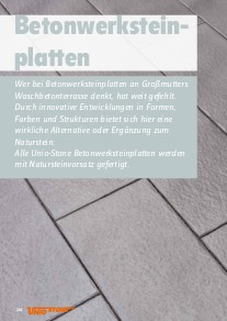 Betonwerkstein- platten  Wer bei Betonwerksteinplatten an Großmutters  Waschbetonterrasse denkt, hat weit gefehlt.  Durch innovative Entwicklungen in Formen,  Farben und Strukturen bietet sich hier eine  wirkliche Alternative oder Ergänzung zum  Naturstein.  Alle Unio-Stone Betonwerksteinplatten werden  mit Natursteinvorsatz gefertigt.  126