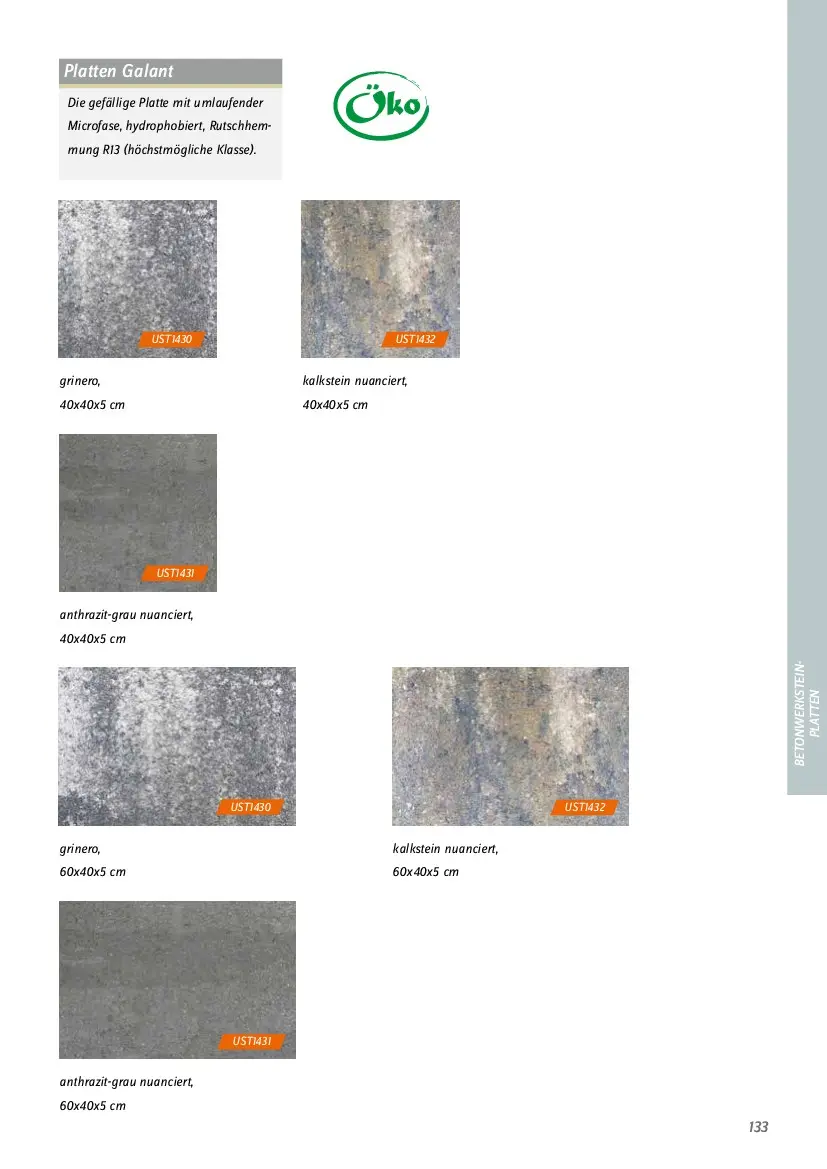 grinero,   40x40x5 cm  Platten Galant  Die gefällige Platte mit umlaufender   Microfase, hydrophobiert, Rutschhem-  mung R13 (höchstmögliche Klasse).  133  UST1430  grinero,   60x40x5 cm  UST1430  kalkstein nuanciert,   60x40x5 cm  UST1432  anthrazit-grau nuanciert,  60x40x5 cm  UST1431  anthrazit-grau nuanciert,   40x40x5 cm  UST1431  kalkstein nuanciert,   40x40x5 cm  UST1432  BETONWERKSTEIN- PLATTEN