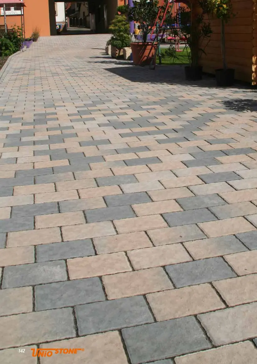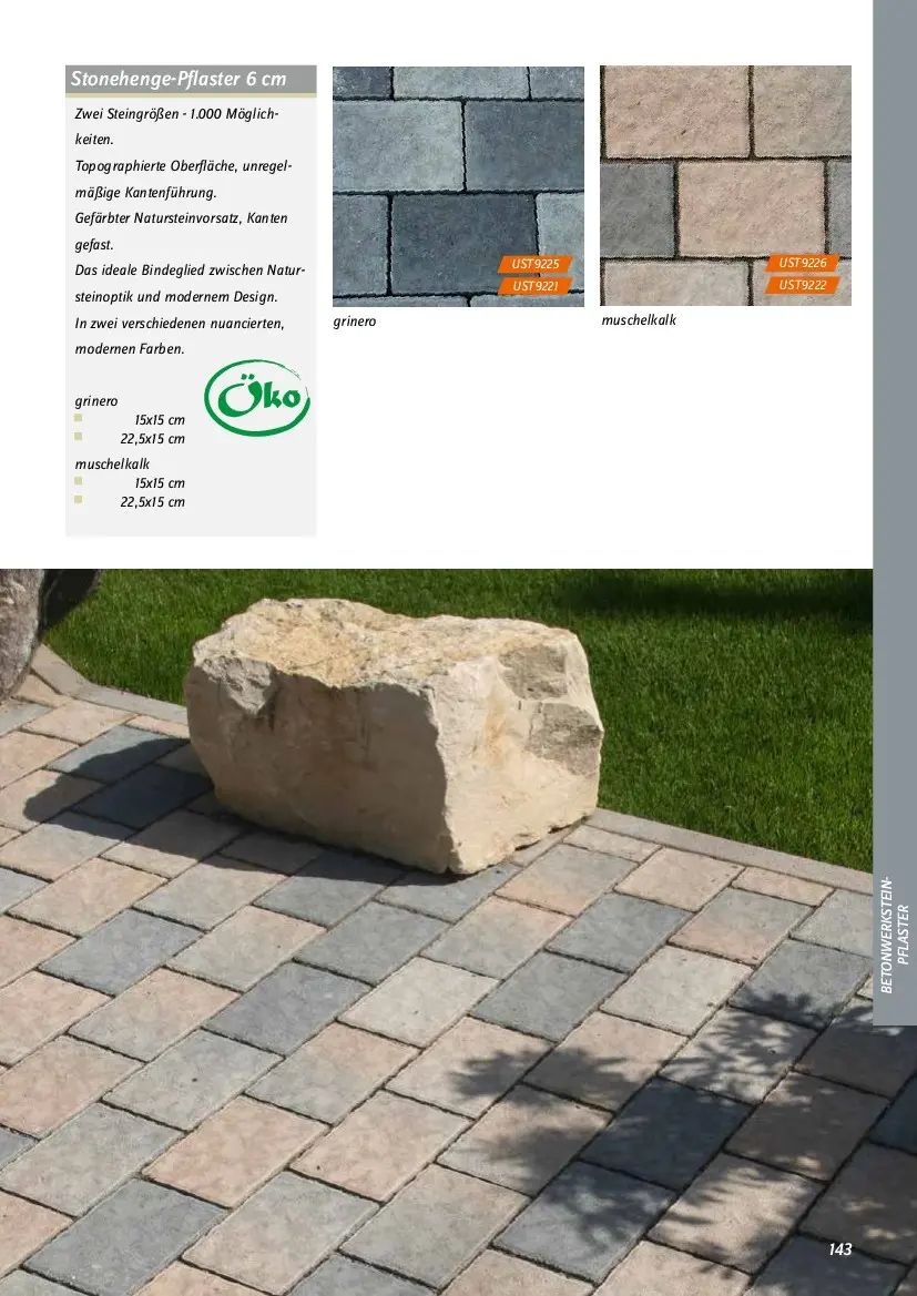 grinero muschelkalk   143  Stonehenge-Pflaster 6 cm  Zwei Steingrößen - 1.000 Möglich-  keiten.   Topographierte Oberfläche, unregel-  mäßige Kantenführung.  Gefärbter Natursteinvorsatz, Kanten   gefast.  Das ideale Bindeglied zwischen Natur-  steinoptik und modernem Design.  In zwei verschiedenen nuancierten,   modernen Farben.  grinero    15x15 cm     22,5x15 cm  muschelkalk    15x15 cm     22,5x15 cm  UST9221  UST9225  UST9222  UST9226  BETONWERKSTEIN- PFLASTER