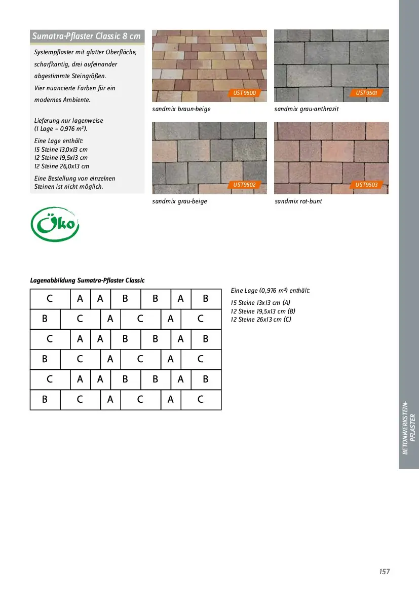 sandmix braun-beige sandmix grau-anthrazit  sandmix grau-beige sandmix rot-bunt  Sumatra-Pflaster Classic 8 cm  Systempflaster mit glatter Oberfläche,  scharfkantig, drei aufeinander   abgestimmte Steingrößen.  Vier nuancierte Farben für ein   modernes Ambiente.  Lieferung nur lagenweise  (1 Lage = 0,976 m2).  Eine Lage enthält: 15 Steine 13,0x13 cm 12 Steine 19,5x13 cm 12 Steine 26,0x13 cm  Eine Bestellung von einzelnen  Steinen ist nicht möglich.  157  UST9500  UST9502  UST9501  UST9503  Lagenabbildung Sumatra-Pflaster Classic Eine Lage (0,976 m²) enthält:  15 Steine 13x13 cm (A) 12 Steine 19,5x13 cm (B) 12 Steine 26x13 cm (C)  BETONWERKSTEIN- PFLASTER