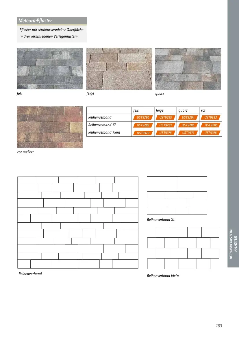 fels feige quarz rot  Reihenverband UST9296 UST9295 UST9294 UST9293  Reihenverband XL UST9288 UST9287 UST9286  UST9285    Reihenverband klein UST9379 UST9378 UST9377 UST9376  Meteora-Pflaster  Pflaster mit strukturveredelter Oberfläche   in drei verschiedenen Verlegemustern.  Reihenverband  fels quarz feige  rot meliert  163  Reihenverband XL  Reihenverband klein  BETONWERKSTEIN- PFLASTER