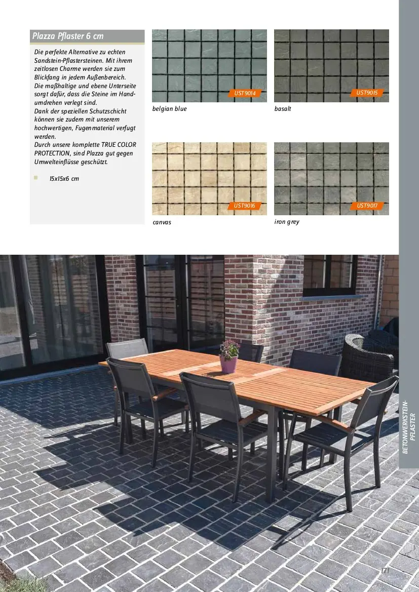 belgian blue  Plazza Pflaster 6 cm  Die perfekte Alternative zu echten  Sandstein-Pflastersteinen. Mit ihrem  zeitlosen Charme werden sie zum  Blickfang in jedem Außenbereich.  Die maßhaltige und ebene Unterseite  sorgt dafür, dass die Steine im Hand- umdrehen verlegt sind. Dank der speziellen Schutzschicht  können sie zudem mit unserem  hochwertigen, Fugenmaterial verfugt  werden.  Durch unsere komplette TRUE COLOR  PROTECTION, sind Plazza gut gegen  Umwelteinflüsse geschützt.     15x15x6 cm  basalt  UST9015 UST9014  iron grey  UST9017  canvas  UST9016  171  BETONWERKSTEIN- PFLASTER