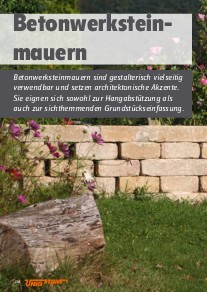 176  Betonwerkstein- mauern  Betonwerksteinmauern sind gestalterisch vielseitig  verwendbar und setzen architektonische Akzente.  Sie eignen sich sowohl zur Hangabstützung als  auch zur sichthemmenden Grundstückseinfassung.