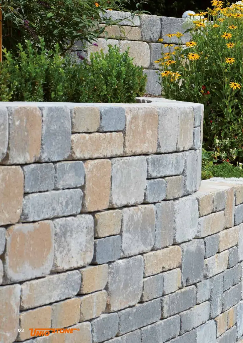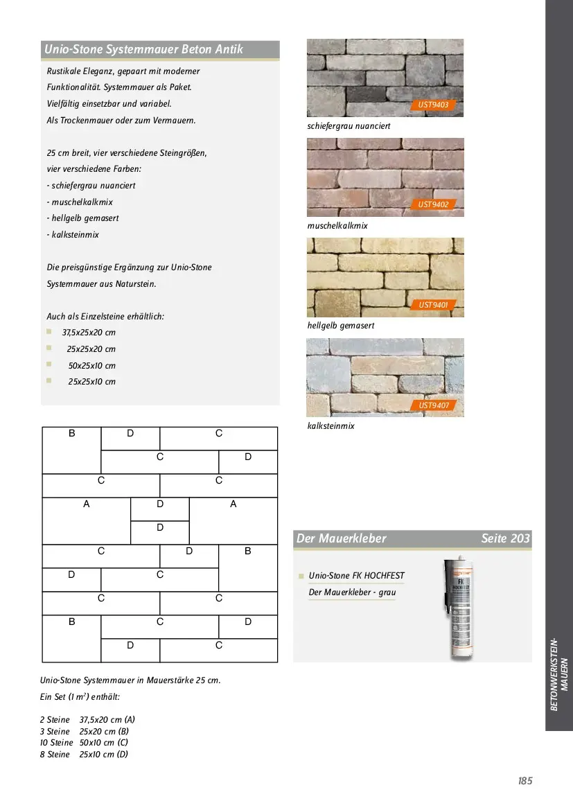 muschelkalkmix  schiefergrau nuanciert  hellgelb gemasert  kalksteinmix  A   D  B  C   C  D   C  C   D   D   A   C  D   D  C   B   C  C   B  C  D   D  C   Unio-Stone Systemmauer in Mauerstärke 25 cm.  Ein Set (1 m2) enthält:  2 Steine 37,5x20 cm (A) 3 Steine 25x20 cm (B) 10 Steine 50x10 cm (C) 8 Steine 25x10 cm (D)  Unio-Stone Systemmauer Beton Antik  Rustikale Eleganz, gepaart mit moderner   Funktionalität. Systemmauer als Paket.  Vielfältig einsetzbar und variabel.   Als Trockenmauer oder zum Vermauern.  25 cm breit, vier verschiedene Steingrößen,  vier verschiedene Farben:  - schiefergrau nuanciert  - muschelkalkmix  - hellgelb gemasert  - kalksteinmix  Die preisgünstige Ergänzung zur Unio-Stone   Systemmauer aus Naturstein.  Auch als Einzelsteine erhältlich:     37,5x25x20 cm       25x25x20 cm       50x25x10 cm       25x25x10 cm   185  UST9403  UST9402  UST9401  UST9407  Der Mauerkleber  Seite 203    Unio-Stone FK HOCHFEST   Der Mauerkleber - grau  BETONWERKSTEIN- MAUERN