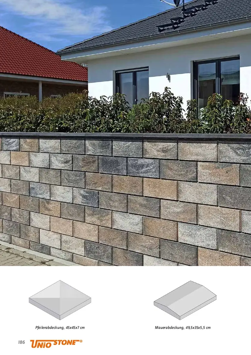 187  Gartenmauer Lino  Mit dem Gartenmauersystem Lino errichten Sie spielend  leicht eine neue geradlinige Gartenmauer oder Abgrenzung.  Durch die seitliche Nut- und Federverbindung erhält die  Mauer eine stabile Verzahnung. Dank hohlem Innenraum haben die Steine ein geringes  Gewicht. Die Mauer kann beliebig bepflanzt oder mit einer  Abdeckplatte verschlossen werden.   Auch verwendbar als: - Abgrenzung oder Begrenzung. - Sichtschutz oder Lärmschutz. - Freistehende Elemente. - Begrünbare Säulen oder Pfosten.  Einsatzbereiche und Aufbauhöhe  (bei einer Füllung mit Sand-Kies-Gemisch)  - Freistehend bis ca. 1,30 m Aufbauhöhe.  - Hinterfüllt ohne Verkehrsbelastung:       - Senkrecht max. ca. 0,70 m Aufbauhöhe.      - Bis 70° Neigung max. ca. 1,60 m Aufbauhöhe.      - Bis 55° Neigung max. ca. 3,60 m Aufbauhöhe.      - Bis 45° Neigung max. ca. 5,00 m Aufbauhöhe.  - Hinterfüllt mit Verkehrsbelastung (PKW):      - Senkrecht max. ca. 0,50 m Aufbauhöhe.      - Bis 70° Neigung max. ca. 1,20 m Aufbauhöhe.  Unsere Unio-Stone Fachberater stehen Ihnen für weitere  Informationen gerne zur Verfügung.  Normalstein, 50x25x20 cm Halbstein, 25x25x20 cm Pfeilerstein, 37,5x37,5x20 cm  sandstein  grinero  kalkstein   UST9380  UST9381  UST9382  Der Mauerkleber  Seite 203    Unio-Stone FK HOCHFEST   Der Mauerkleber - grau  BETONWERKSTEIN- MAUERN