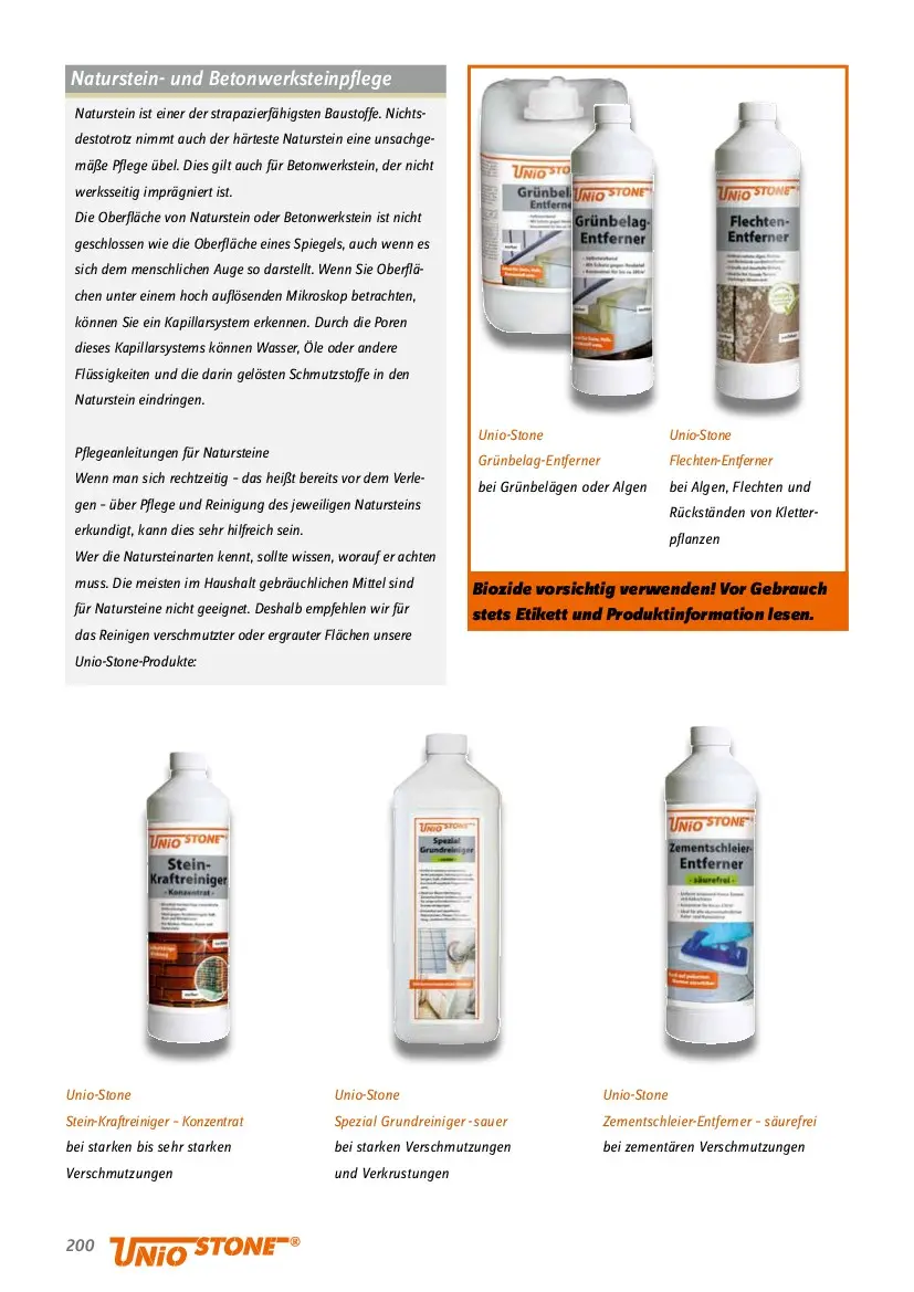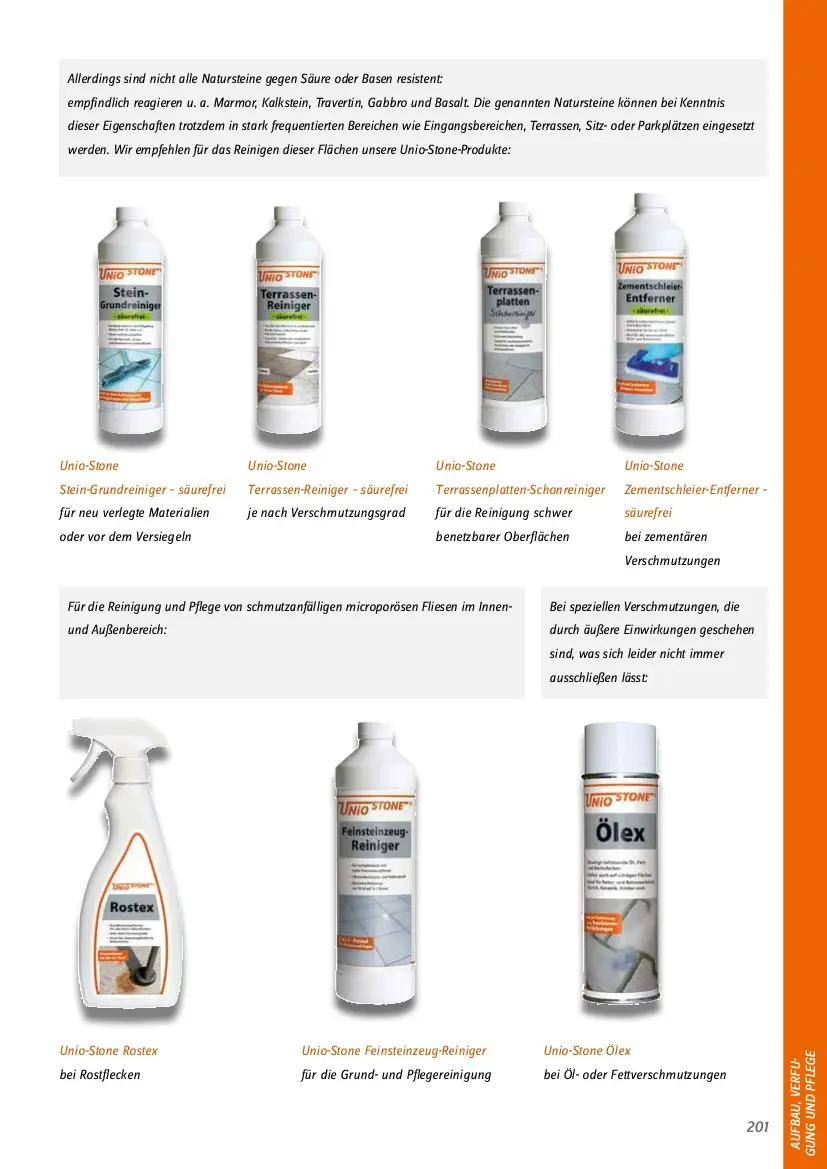 201  AUFBAU, VERFU- GUNG UND PFLEGE  Allerdings sind nicht alle Natursteine gegen Säure oder Basen resistent:  empfindlich reagieren u. a. Marmor, Kalkstein, Travertin, Gabbro und Basalt. Die genannten Natursteine können bei Kenntnis   dieser Eigenschaften trotzdem in stark frequentierten Bereichen wie Eingangsbereichen, Terrassen, Sitz- oder Parkplätzen eingesetzt   werden. Wir empfehlen für das Reinigen dieser Flächen unsere Unio-Stone-Produkte:  Unio-Stone  Stein-Grundreiniger – säurefrei   für neu verlegte Materialien   oder vor dem Versiegeln  Unio-Stone   Terrassen-Reiniger – säurefrei  je nach Verschmutzungsgrad  Unio-Stone  Terrassenplatten-Schonreiniger  für die Reinigung schwer   benetzbarer Oberflächen  Unio-Stone   Zementschleier-Entferner –   säurefrei  bei zementären   Verschmutzungen  Unio-Stone Rostex   bei Rostflecken  Unio-Stone Feinsteinzeug-Reiniger  für die Grund- und Pflegereinigung  Unio-Stone Ölex  bei Öl- oder Fettverschmutzungen  Bei speziellen Verschmutzungen, die   durch äußere Einwirkungen geschehen   sind, was sich leider nicht immer   ausschließen lässt:  Für die Reinigung und Pflege von schmutzanfälligen microporösen Fliesen im Innen-   und Außenbereich: