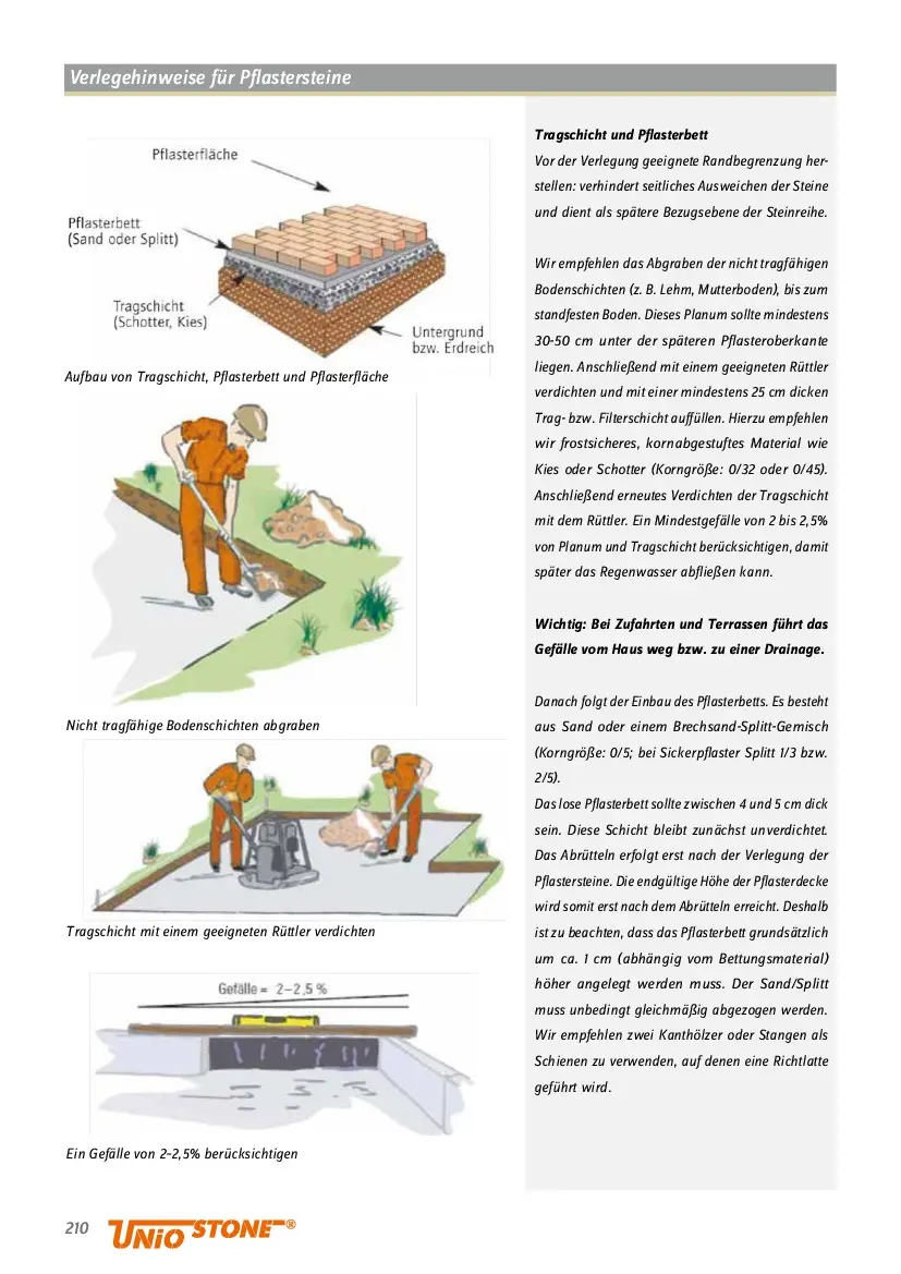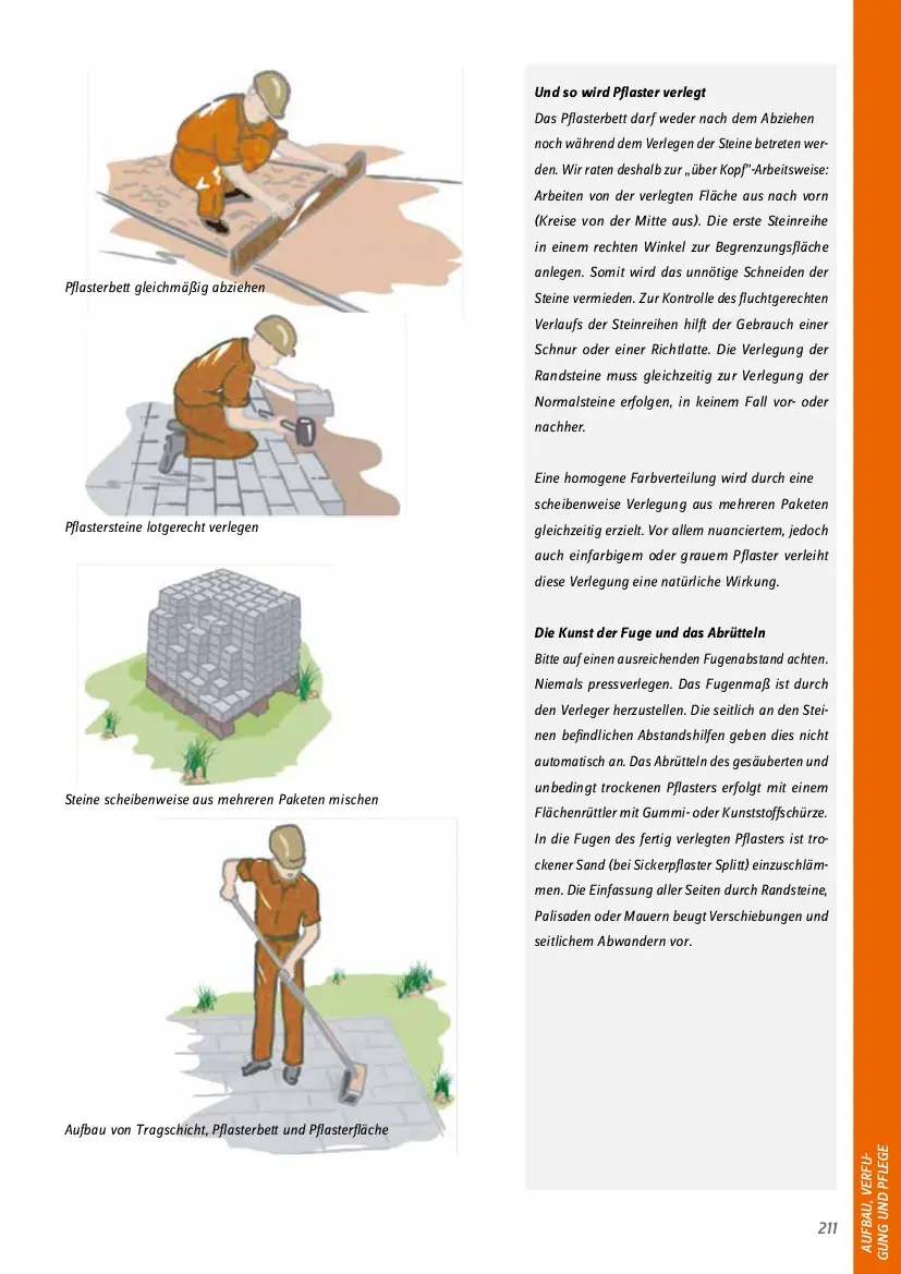 Pflasterbett gleichmäßig abziehen  Pflastersteine lotgerecht verlegen  Steine scheibenweise aus mehreren Paketen mischen  Aufbau von Tragschicht, Pflasterbett und Pflasterfläche  211  Und so wird Pflaster verlegt  Das Pflasterbett darf weder nach dem Abziehen  noch während dem Verlegen der Steine betreten wer-  den. Wir raten deshalb zur „über Kopf”-Arbeitsweise:   Arbeiten von der verlegten Fläche aus nach vorn   (Kreise von der Mitte aus). Die erste Steinreihe   in einem rechten Winkel zur Begrenzungsfläche   anlegen. Somit wird das unnötige Schneiden der   Steine vermieden. Zur Kontrolle des fluchtgerechten   Verlaufs der Steinreihen hilft der Gebrauch einer   Schnur oder einer Richtlatte. Die Verlegung der   Randsteine muss gleichzeitig zur Verlegung der   Normalsteine erfolgen, in keinem Fall vor- oder   nachher.  Eine homogene Farbverteilung wird durch eine  scheibenweise Verlegung aus mehreren Paketen   gleichzeitig erzielt. Vor allem nuanciertem, jedoch   auch einfarbigem oder grauem Pflaster verleiht   diese Verlegung eine natürliche Wirkung.  Die Kunst der Fuge und das Abrütteln  Bitte auf einen ausreichenden Fugenabstand achten.   Niemals pressverlegen. Das Fugenmaß ist durch   den Verleger herzustellen. Die seitlich an den Stei-  nen befindlichen Abstandshilfen geben dies nicht   automatisch an. Das Abrütteln des gesäuberten und   unbedingt trockenen Pflasters erfolgt mit einem   Flächenrüttler mit Gummi- oder Kunststoffschürze.    In die Fugen des fertig verlegten Pflasters ist tro-  ckener Sand (bei Sickerpflaster Splitt) einzuschläm-  men. Die Einfassung aller Seiten durch Randsteine,   Palisaden oder Mauern beugt Verschiebungen und   seitlichem Abwandern vor.  AUFBAU, VERFU- GUNG UND PFLEGE